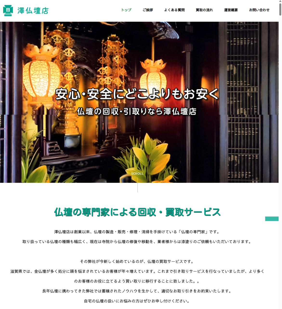 仏壇じまいをしようとしたら、断られてしまったりして、お困りではありませんか?でも大丈夫。彦根市芹川町の「澤仏壇店」は、仏壇の買い取りだけに特化したお店。決して高額ではありません。でも澤仏壇店は、大切なお仏壇をやむなく手放す皆様の、お心に寄り添いながら、丁寧にお買取りさせていただきます。電話は0749、23の4936。「兄さん、四九36(しくさんじゅうろく)」と覚えてください。お見積無料。最短翌日にスピードお買取り。なお、家具調仏壇など一部、お買取りできない仏壇もあります。「兄さん、四九36」にお電話の際、お尋ねくださいね。