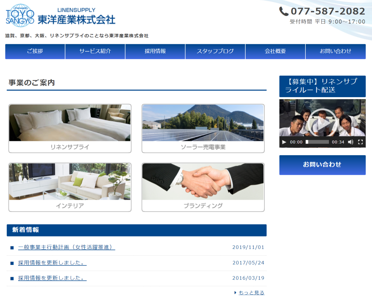 リネンって、なんやねん?リネンサプライは、ホテルや旅館などの宿泊施設に、シーツやタオルなどを、クリーニングサービス付きで、レンタルするお仕事やねん。リネンサプライの東洋産業は、野洲の本社工場を中心に、滋賀はもちろん、京都や大阪、東京都内のホテルや宿泊施設に雨の日も風の日も休むことなく、高品質なリネンを安定してお届けしている会社です。実はリネンサプライって、日本が目指す観光立国に欠かすことのできない成長産業で、そのニーズは右肩上がり!リネンの東洋産業は、やっぱ、いいね~~~~~~ん!