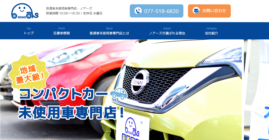 この度、守山市横江町に、県下最大級のコンパクトカー専門店NOAS(ノアーズ) がオープンしました!取り扱い車種は、例えば、ソリオ、スイフト、ノートなどの、登録済み未使用車。ナンバー登録だけされた車である、登録済未使用車は、ノアーズでは走行100キロ以内のコンパクトカーばかり!オールメーカーから選び放題!地域最安値に挑戦する、コンパクトカー専門店ノアーズの場所は、湖南幹線道路沿い、立命館守山高校のちょっと、草津寄り、出光マークのガソリンスタンドの奥ですよー!