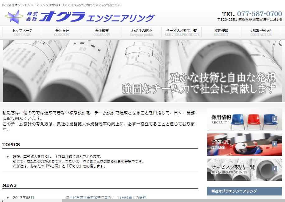 県道2号線、野洲市「永原交差点」を、琵琶湖に向かって100m。老舗美容室のビルの3階に、オグラエンジニアリングはあります。私たちの仕事は「薬液プラント設計」の中の「半導体、設備設計」。お受けする仕事量の割に、CADを操る設計士や、設計アシスタントが、不足しまくってます。求めている人材は、頭の中で、立体的にモノを考えられる方であれば、卒業が美術系や工業系でなくてもOK。経験の有無、男女も問いません。社名にはエンジニアリング。でも設計会社。オグラ、オグラ、オグラエンジニアリング。でも社長の名前は加藤さんです。