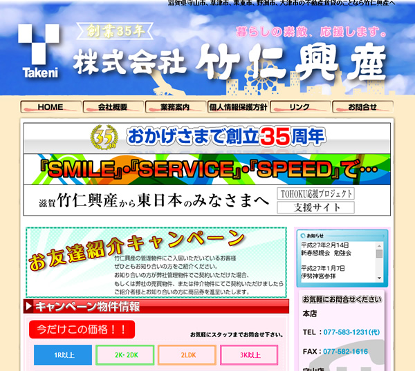 守山、草津、栗東、野洲で賃貸アパートをお探しなら!お気軽に竹仁興産へ!!「暮らしの素敵、応援します!」をキャッチフレーズにお客様の安心・安全・快適を願い、そして地元のお世話になりお陰様でなんと創業35年の実績!!アパート一棟、一棟を地道に巡回パトロールさせていただき、皆様のアドバイザーとして、日々お部屋の情報を提供していまーす。賃貸アパート情報のことならお気軽に地元の竹仁興産へお立ち寄りください。ホームページは竹仁興産で一発検索!お近くの賃貸アパート情報は地元の竹仁興産で仕入れたいですよね~